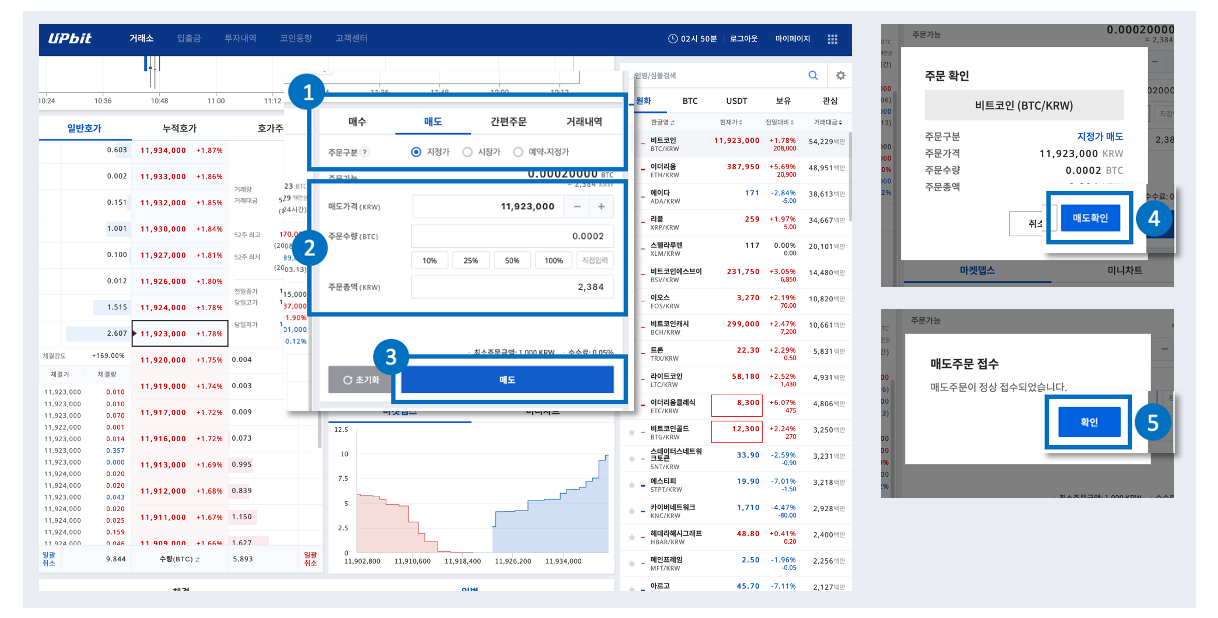 비트코인을 판매하고자 할 경우, 판매하고자 하는 수량과 가격을 입력한 후 '판매' 버튼을 클릭하면 됩니다. 판매가 완료되면 알림이 뜨며, 거래 내역에서 확인할 수 있습니다.